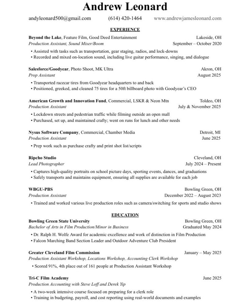I am a graduate of Bowling Green State University ('24), with a B.A. in film production and a minor in business. I started working as a sound mixer/boom operator in the film industry during my freshman year with the independent feature film Beyond the Lake (Porcari, 2021). Since then, I have found my passion for filmmaking through cinematography. My 16mm student film, Nature vs Nurture, screened in Michigan, Ohio, North Carolina, and the Czech Republic., I discovered a passion for experimental film and nature videography. In my free time, I like to climb, hike, and play disc golf.